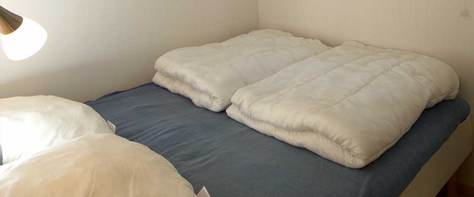 2 separate soverum – en med enkeltseng og en med dobbeltseng. Derudover er der er udtrækssofa i stuen og 3 madrasser på hemsen. Der er dyner og puder til 6 personer.